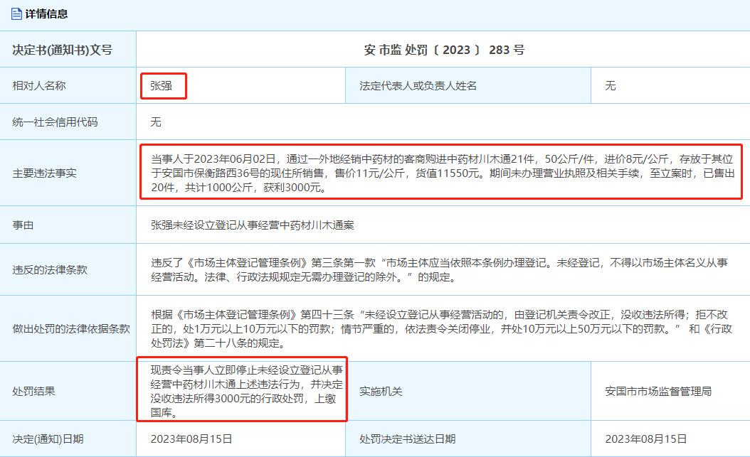 主要违法事实:当事人于2023年06月02日,通过一外地经销中药材的客商购进中药材川木通21件,50公斤/件,进价8元/公斤,存放于其位于安国市保衡路西36号的现住所销售,售价11元/公斤,货值11550元。期间未办理营业执照及相关手续,至立案时,已售出20件,共计1000公斤,获利3000元。