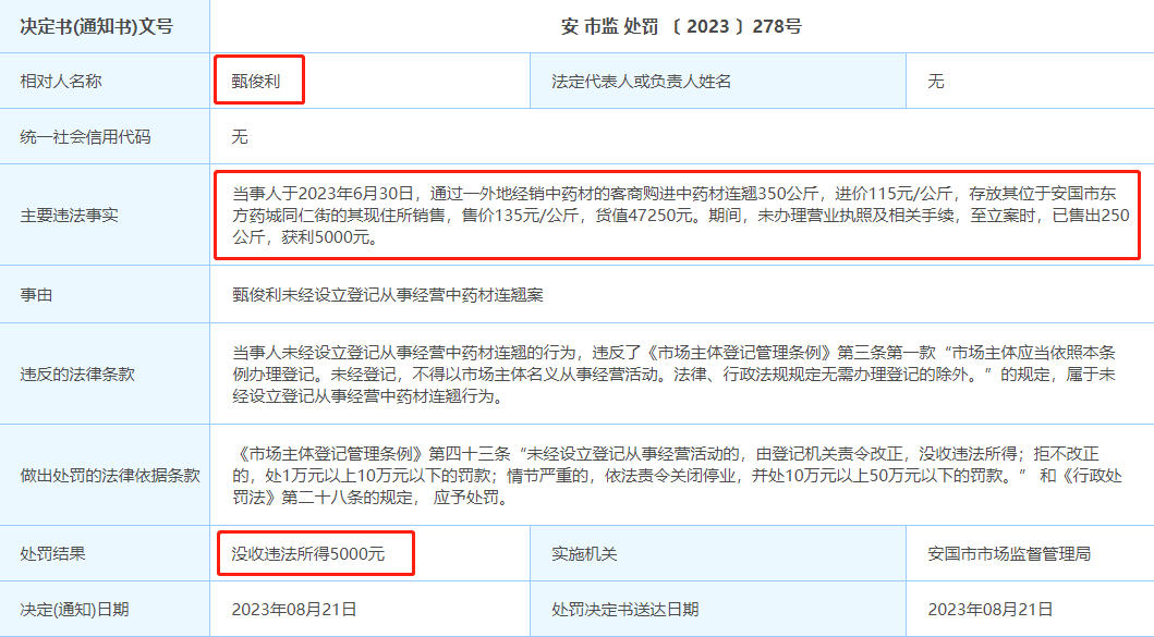 主要违法事实:当事人于2023年6月30日,通过一外地经销中药材的客商购进中药材连翘350公斤,进价115元/公斤,存放其位于安国市东方药城同仁街的其现住所销售,售价135元/公斤,货值47250元。期间,未办理营业执照及相关手续,至立案时,已售出250公斤,获利5000元。