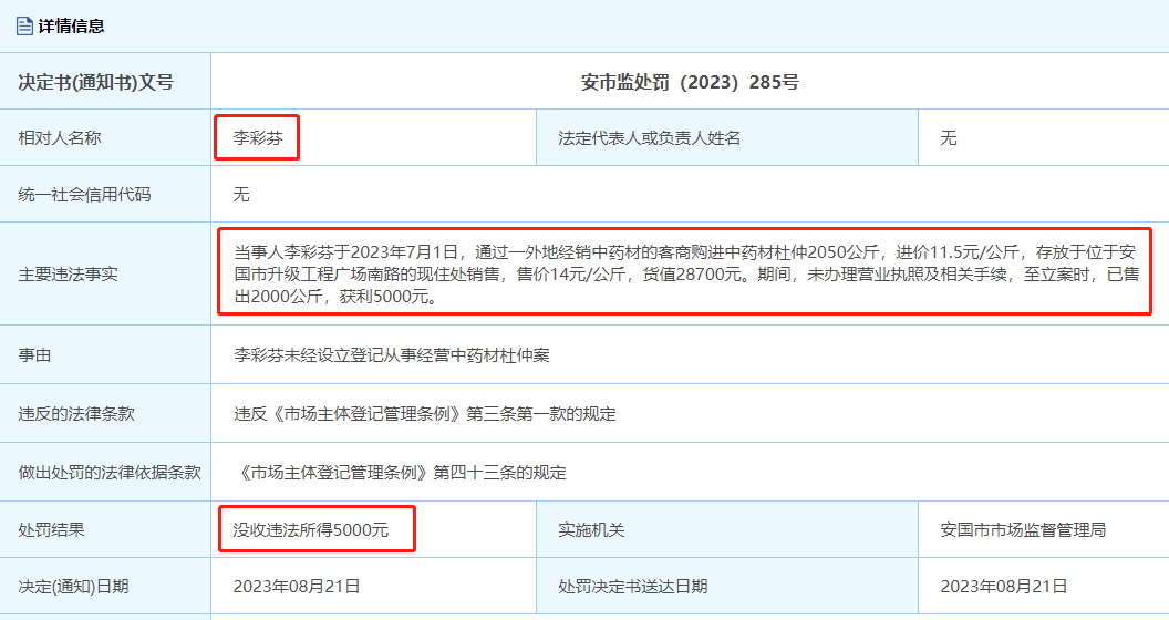 主要违法事实:当事人李彩芬于2023年7月1日,通过一外地经销中药材的客商购进中药材杜仲2050公斤,进价11.5元/公斤,存放于位于安国市升级工程广场南路的现住处销售,售价14元/公斤,货值28700元。期间,未办理营业执照及相关手续,至立案时,已售出2000公斤,获利5000元。