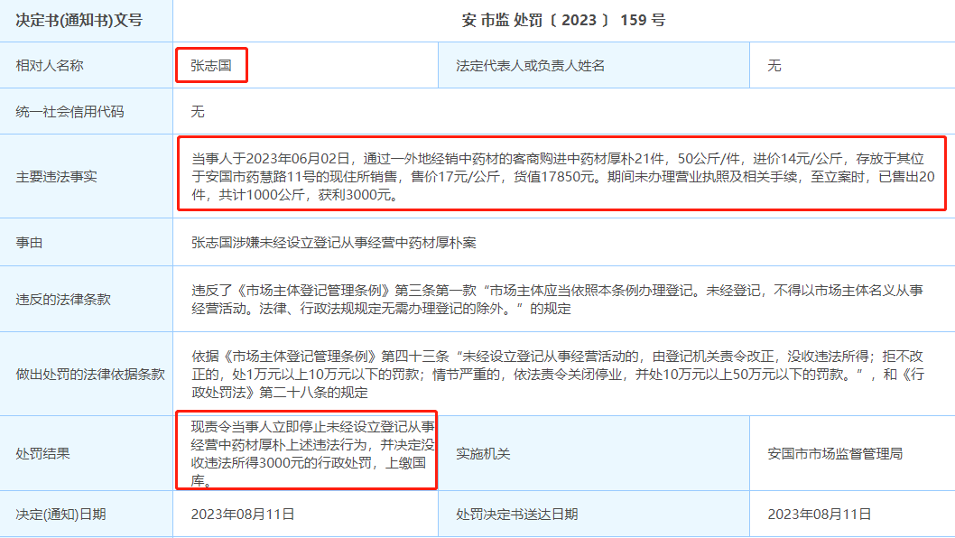 主要违法事实:当事人于2023年06月02日,通过一外地经销中药材的客商购进中药材厚朴21件,50公斤/件,进价14元/公斤,存放于其位于安国市药慧路11号的现住所销售,售价17元/公斤,货值17850元。期间未办理营业执照及相关手续,至立案时,已售出20件,共计1000公斤,获利3000元。
