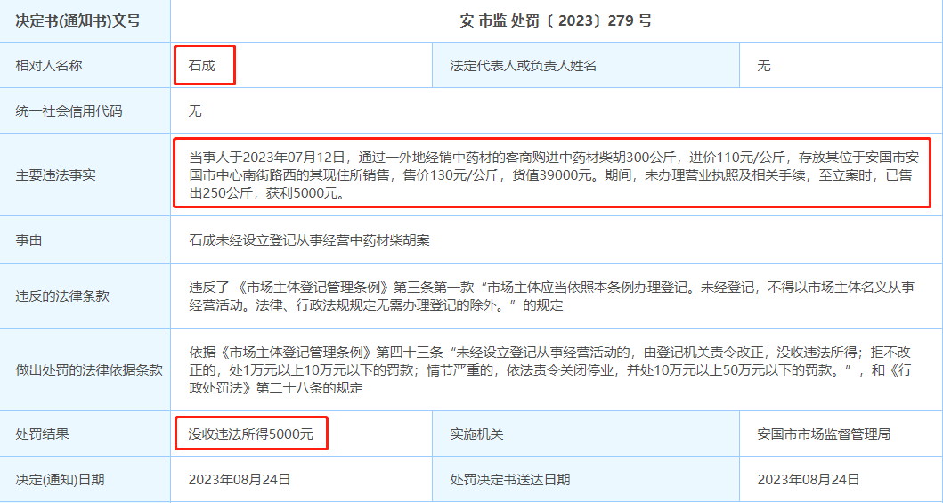 主要违法事实:当事人于2023年07月12日,通过一外地经销中药材的客商购进中药材柴胡300公斤,进价110元/公斤,存放其位于安国市安国市中心南街路西的其现住所销售,售价130元/公斤,货值39000元。期间,未办理营业执照及相关手续,至立案时,已售出250公斤,获利5000元。