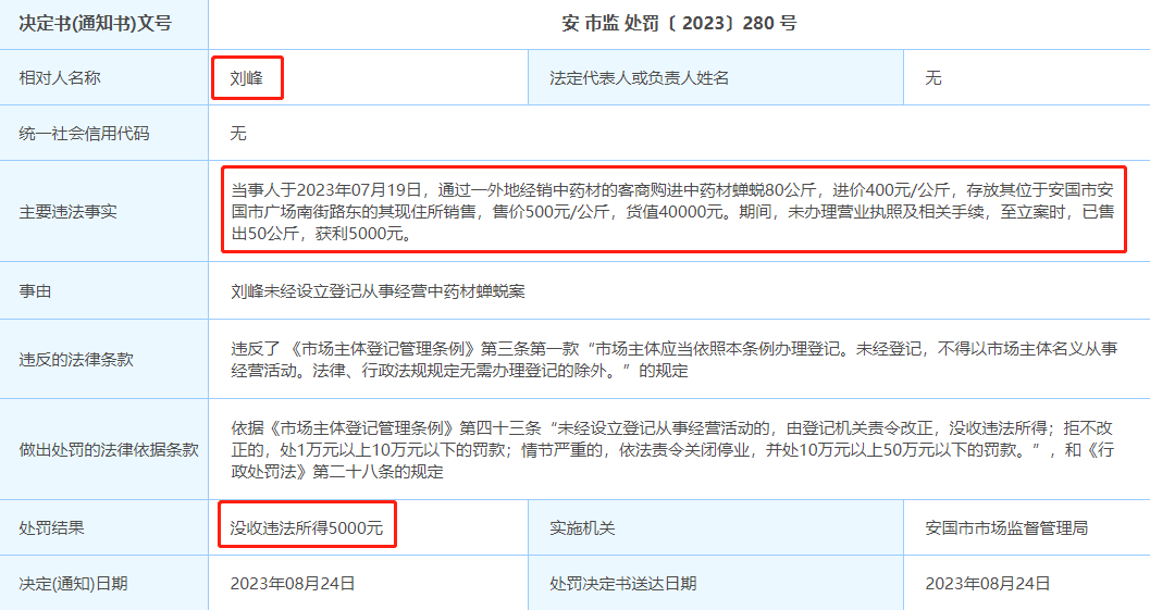 主要违法事实:当事人于2023年07月19日,通过一外地经销中药材的客商购进中药材蝉蜕80公斤,进价400元/公斤,存放其位于安国市安国市广场南街路东的其现住所销售,售价500元/公斤,货值40000元。期间,未办理营业执照及相关手续,至立案时,已售出50公斤,获利5000元。